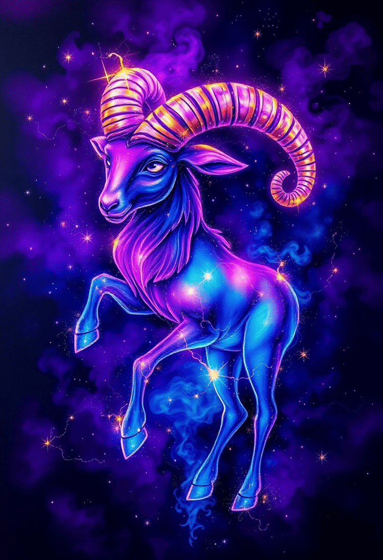 An ethereal painting of the Aries constellation, depicted as a vibrant ram adorned with cosmic hues of deep purple, electric blue, and luminous gold.