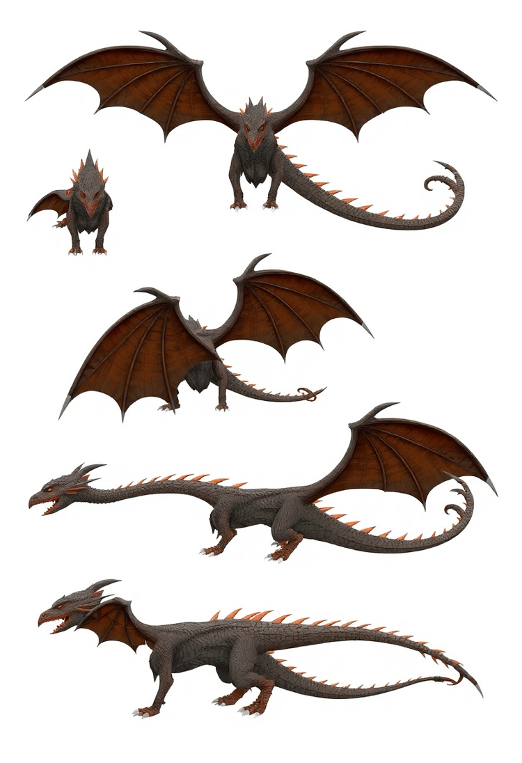 A majestic 3D model sheet depicting a fantasy dragon with imposing wings, a spiked tail, and flame-like scales. Various perspectives showcase the dragon's fearsome grandeur.