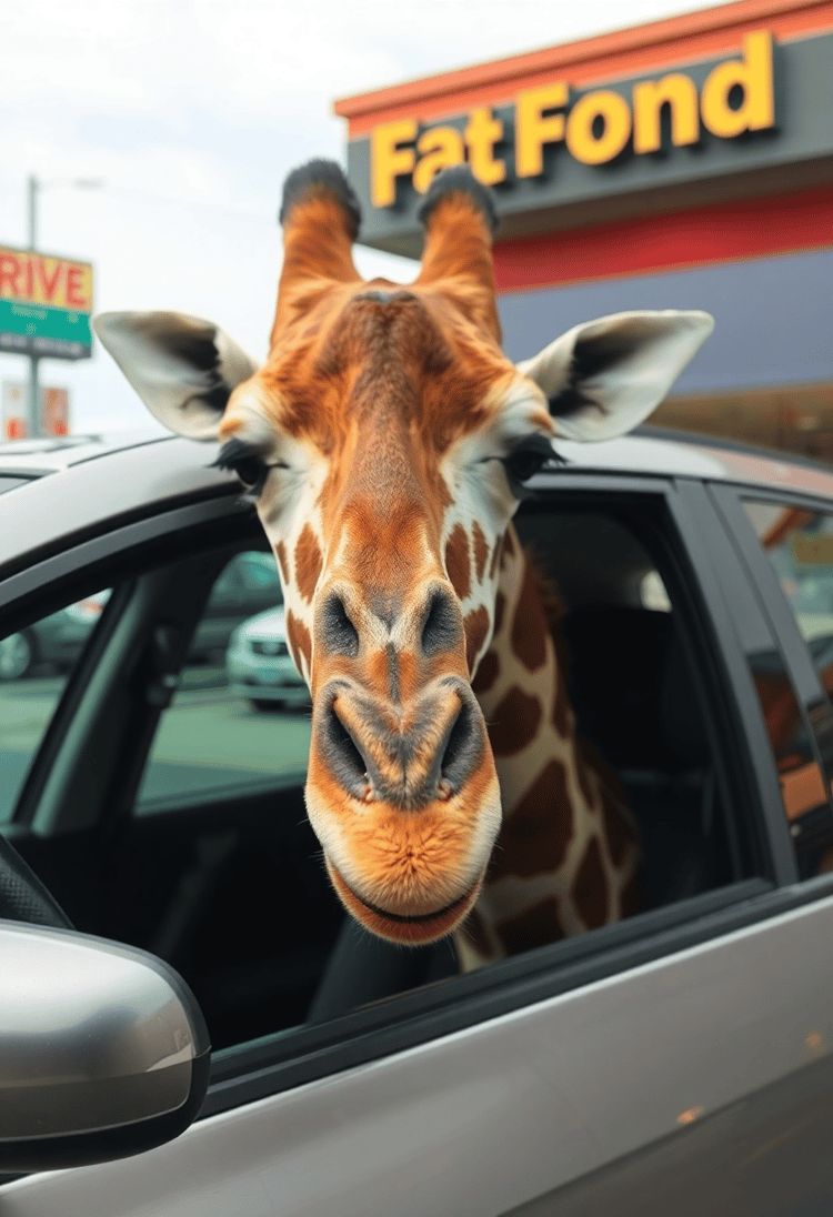A giraffe is awkwardly trying to fit into a tiny car at a drive-through fast food restaurant. Its neck is comically tangled around the roof.