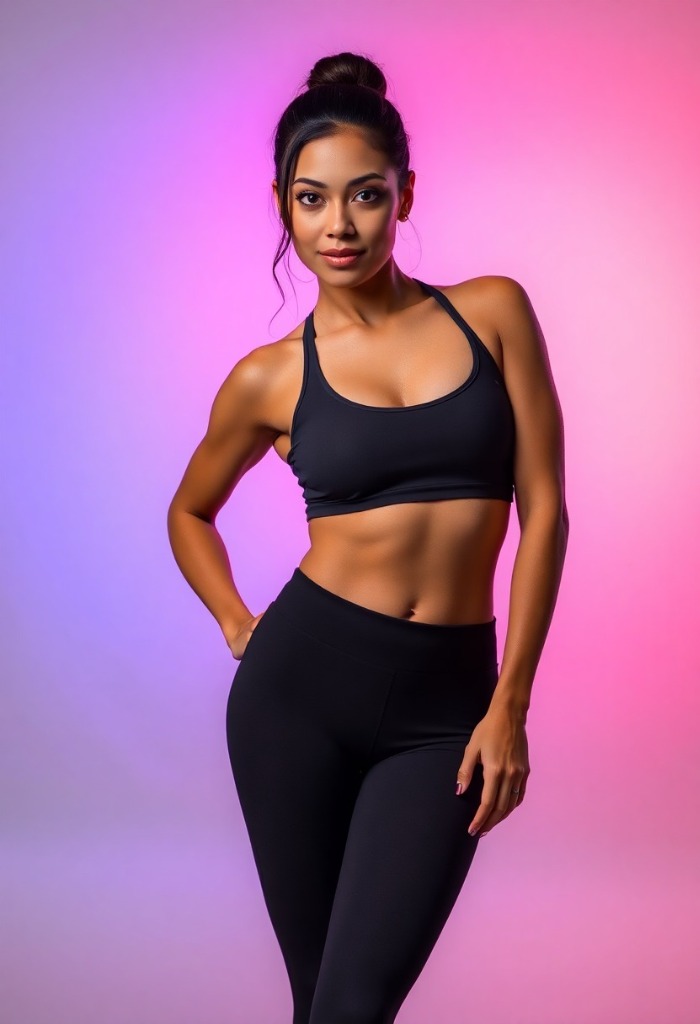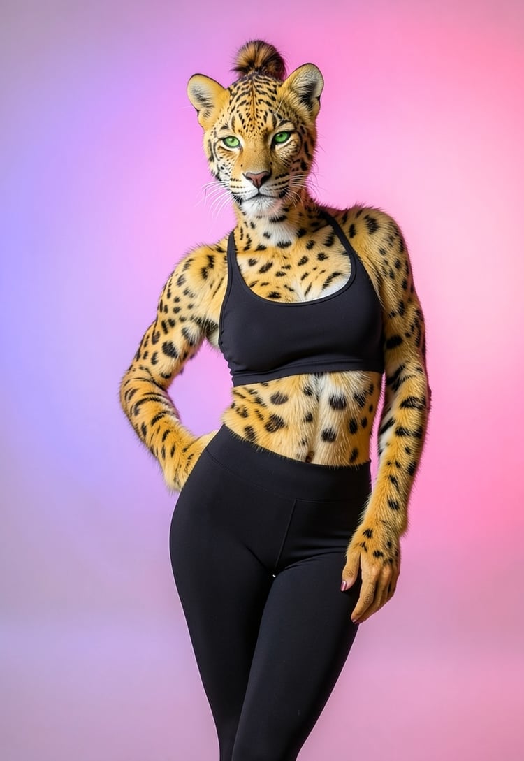Create a hyper-realistic portrait of the same person as a human-leopard hybrid, preserving facial identity, skin color, expression, pose, and framing. Blend leopard traits into the human face: add faint spotted rosette patterns across the skin, give the eyes an intense green tint, and introduce sleek short golden fur blending across the cheekbones and temples. Keep the original face shape and bone structure fully intact. The result should look like one unified creature — a person whose features have naturally merged with leopard characteristics. furry leopard golden furry body, black yoga pants.