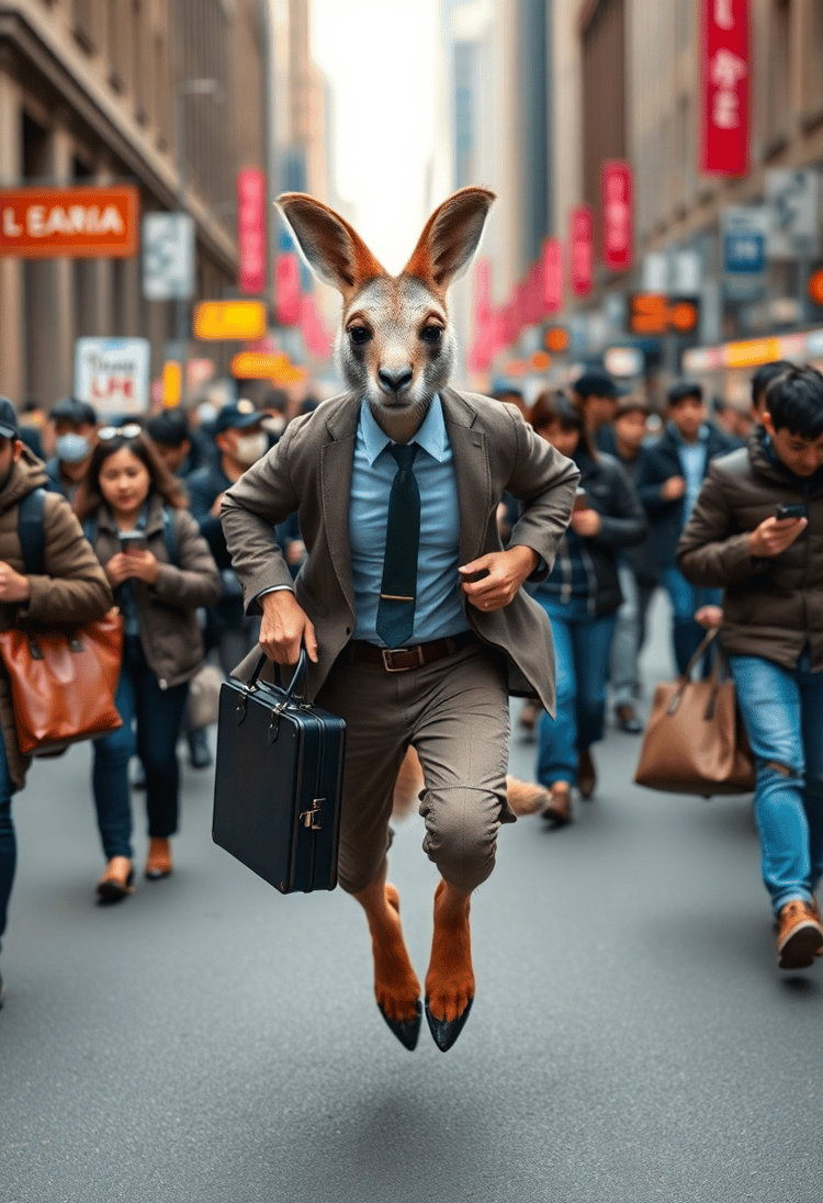 In the rush hour hustle, a kangaroo-headed commuter hops through the crowded streets, clutching a briefcase. His athletic build and poised demeanor stand out amidst the urban chaos.
