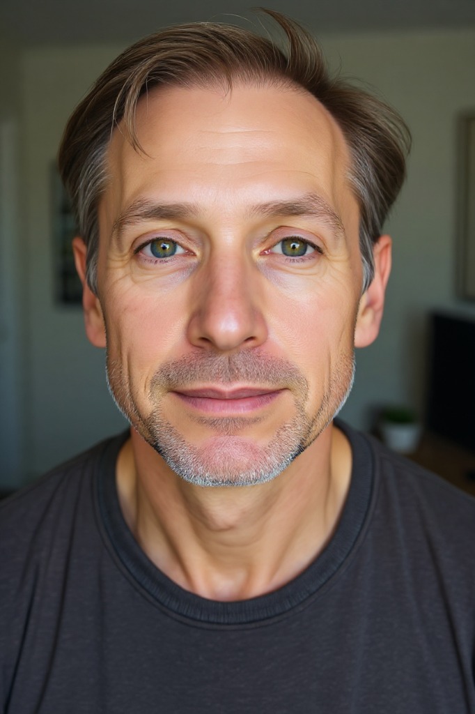 Create a hyper-realistic portrait of the same person as a human-pig hybrid, preserving facial identity, skin color, expression, pose, and framing. Blend pig traits into the human face: widen and flatten the nose into a subtle snout shape with visible nostrils, add small pointed ears, introduce soft pink skin tones across the cheeks and forehead, and give the eyes a small round bright quality. Keep the original face shape and bone structure fully intact. The result should look like one unified creature — a person whose features have naturally merged with pig characteristics.