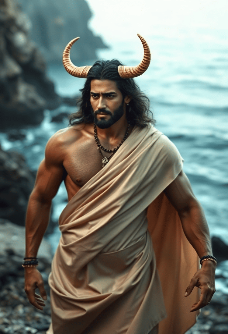 A strong image of a male Taurus deity draped in silk, with a serene ocean backdrop, capturing the romantic and luxurious aspect of this zodiac sign.