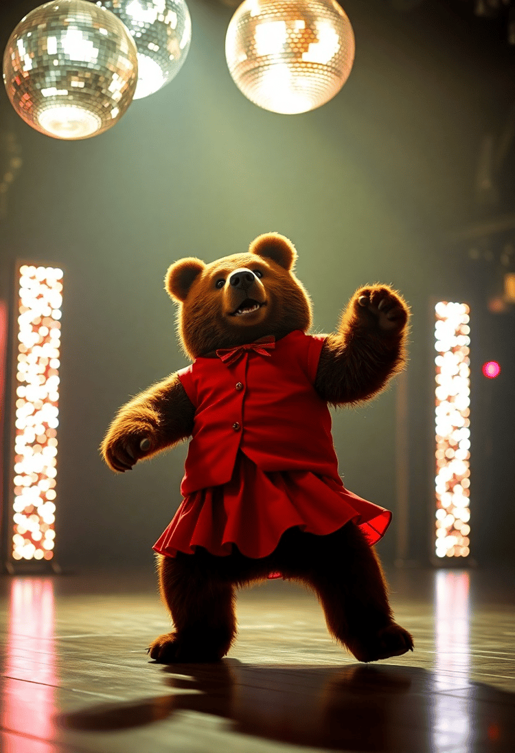 Under the sparkling disco lights, a bear is seen twirling in salsa style. It's dressed in a snazzy red outfit that complements its buoyant dance steps.