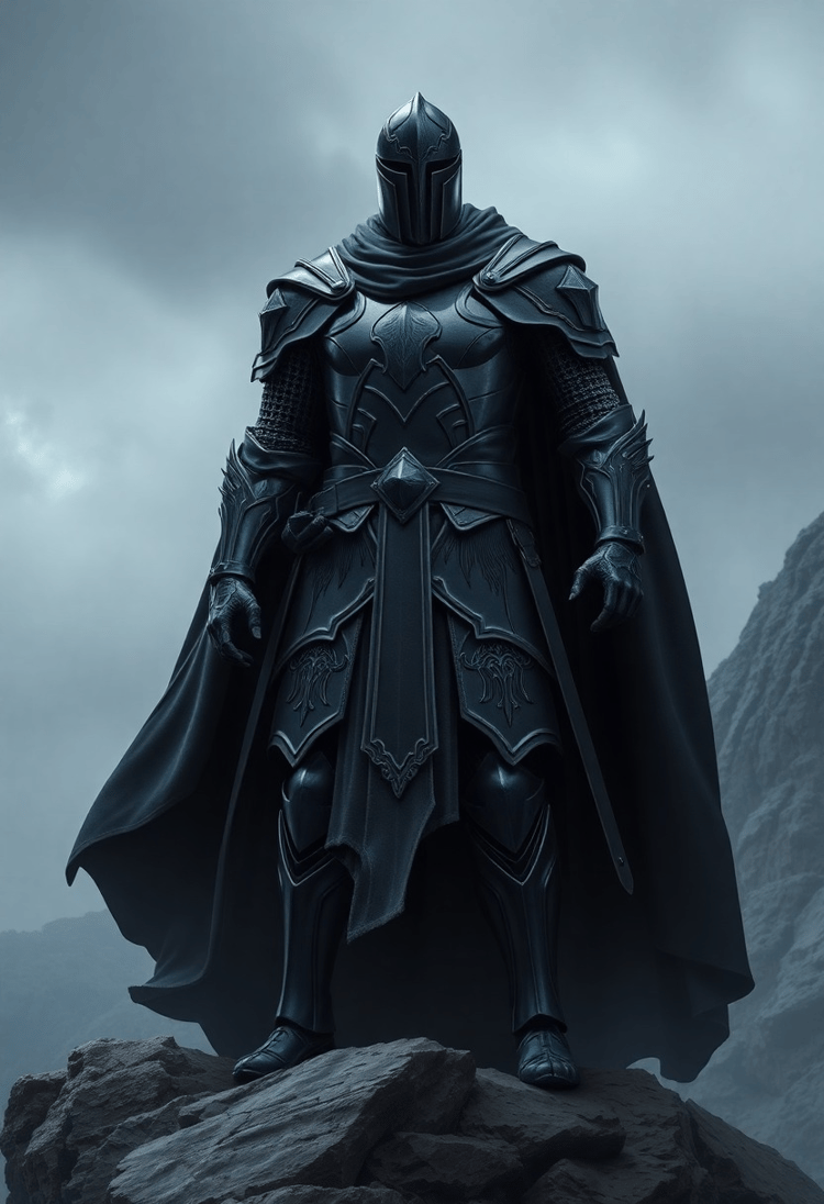 A formidable knight clad in pitch-black armor stands atop a rocky cliff. His presence is commanding, with a cloak flowing like liquid night. His helmet obscures his features, but the aura of dread he exudes is unmistakable.