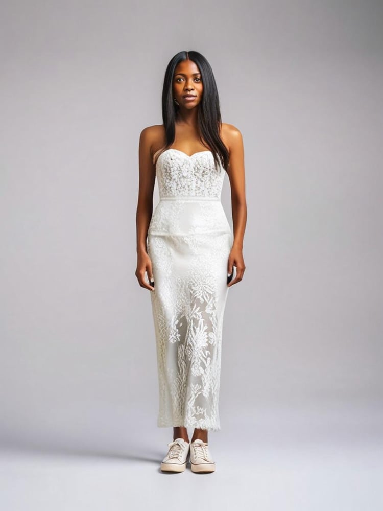 Virtually try on a wedding dress using Pincel AI. Upload a photo and a second reference image of a wedding dress. AI will combine the photos.