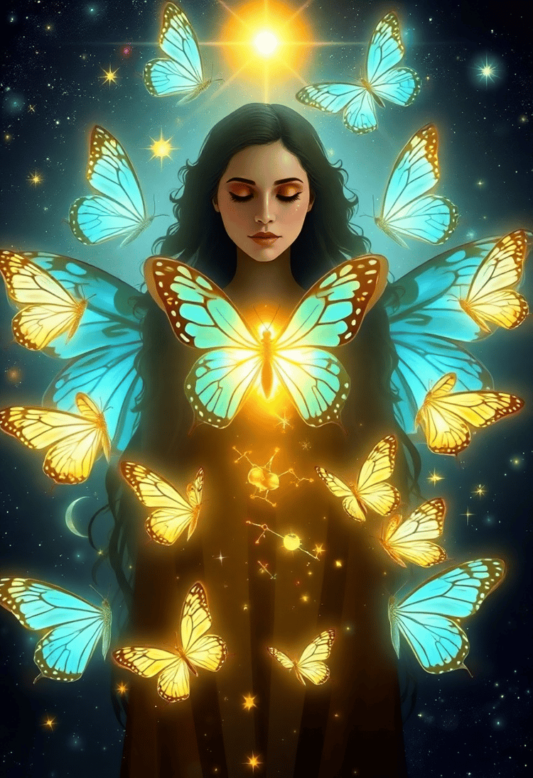 A beautifully Photoshopped image features a Virgo goddess surrounded by luminous cosmic butterflies. Each butterfly embodies different constellations, linking the Virgo with the vastness of the universe.