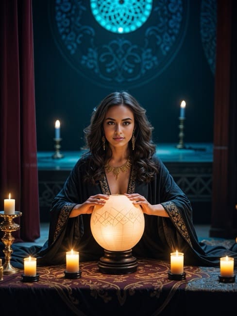 Peek into the future! Add your face to make a mysterious fortune teller AI portrait scene.